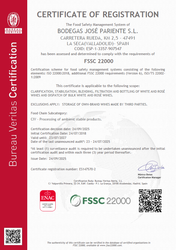 Bodegas José Pariente, desde su fundación, ha realizado y mantiene una decidida apuesta por la calidad y seguridad alimentaria del vino elaborado y embotellado. Para ello, se asienta en los siguientes pilares: