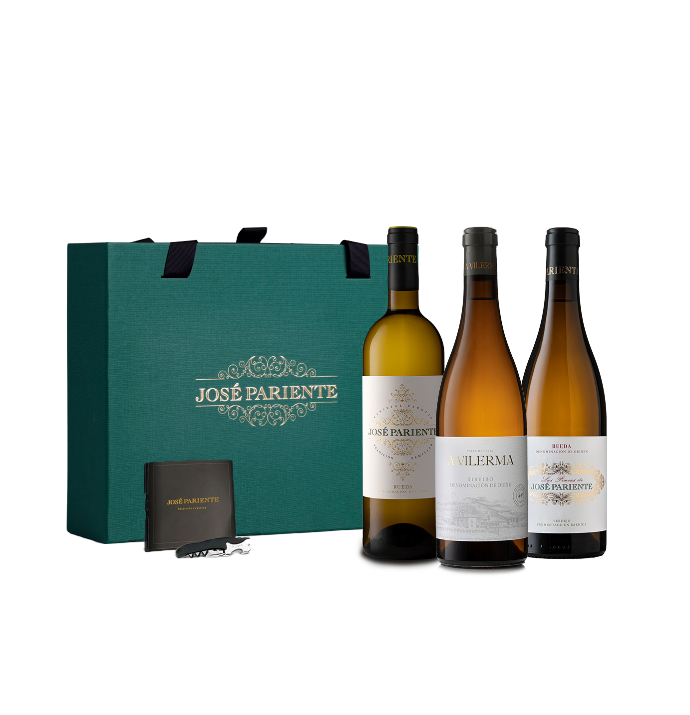 Estuche compuesto por dos botellas de José Pariente Verdejo 2024 (D.O. Rueda), Las Fincas de José Pariente 2023 (DO Rueda) y A Vilerma 2024 (D.O Ribeiro) + sacacorchos